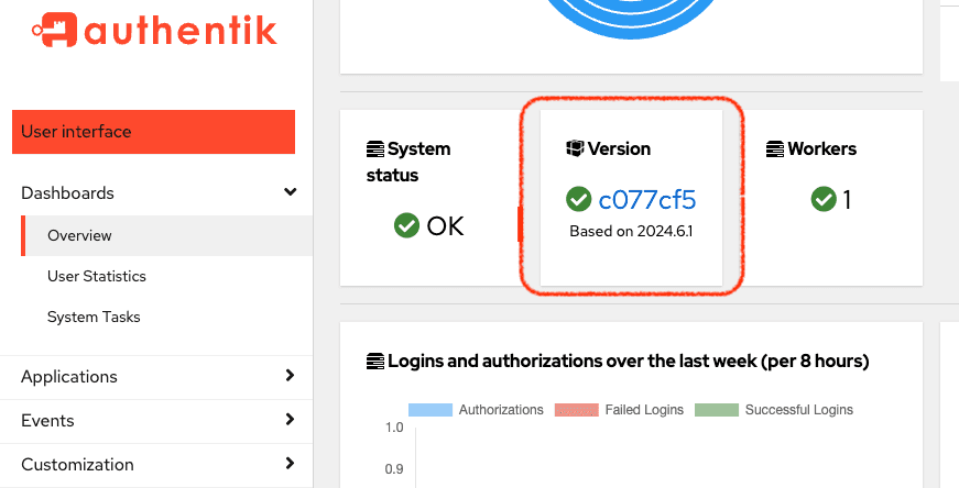 You can view the current version of your authentik instance by logging in to the Admin interface, and then navigating to Dashboards > Overview.